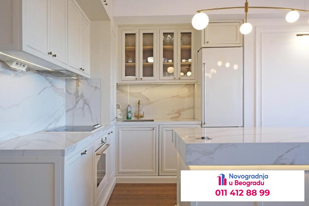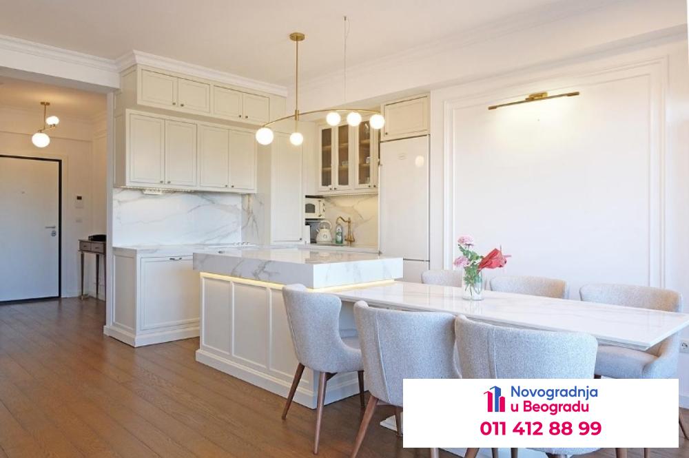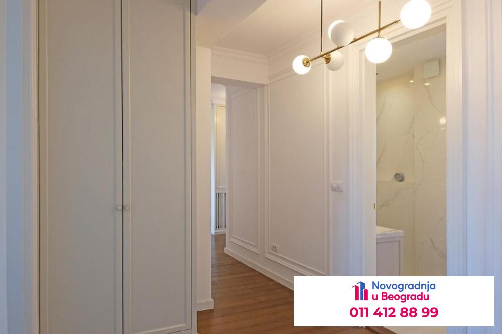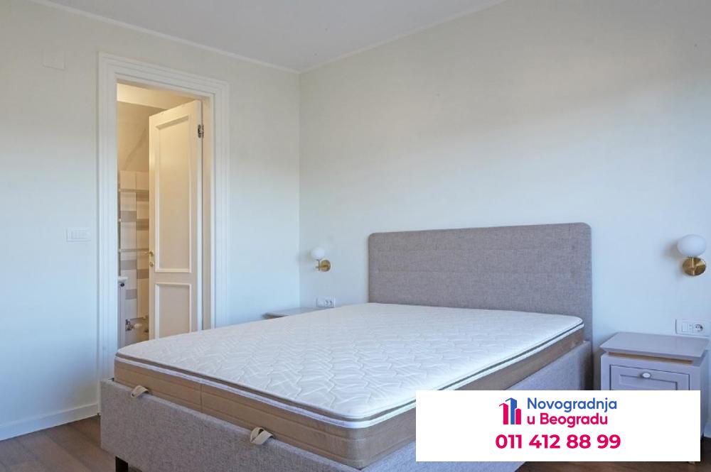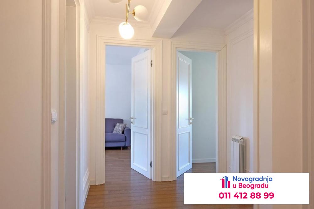 Raspored prostorija: predsoblje, hodnik, prostran dnevni boravak povezan sa trpezarijom i kuhinjom, tri spavaće sobe, dva moderno opremljena kupatila, posebna prostorija za garderober/cipelarnik i velika terasa koja daje poseban osećaj otvorenosti i privatnosti.