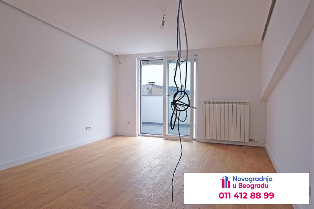 Sastoji se od prostrane sobe, predviđene za dnevnu, kuhinju i trpezariju koja ima izlaz na veliku terasu, kao i kupatila i ulaznog hodnika. U najvišem delu stana visina plafona je 2.80 metara, a od polovine dnevne sobe blaga kosina se spušta na 2.20 metara visine u delu gde su balkonska vrata.