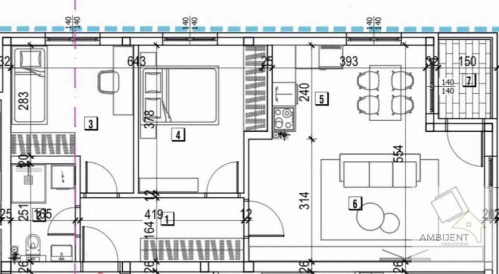 Stan ima 63m2 i čine ga dnevna soba sa kuhinjom i trpezarijom, dve spavaće sobe, hodnik sa prostorom za garderobu, kupatilo i terasa.