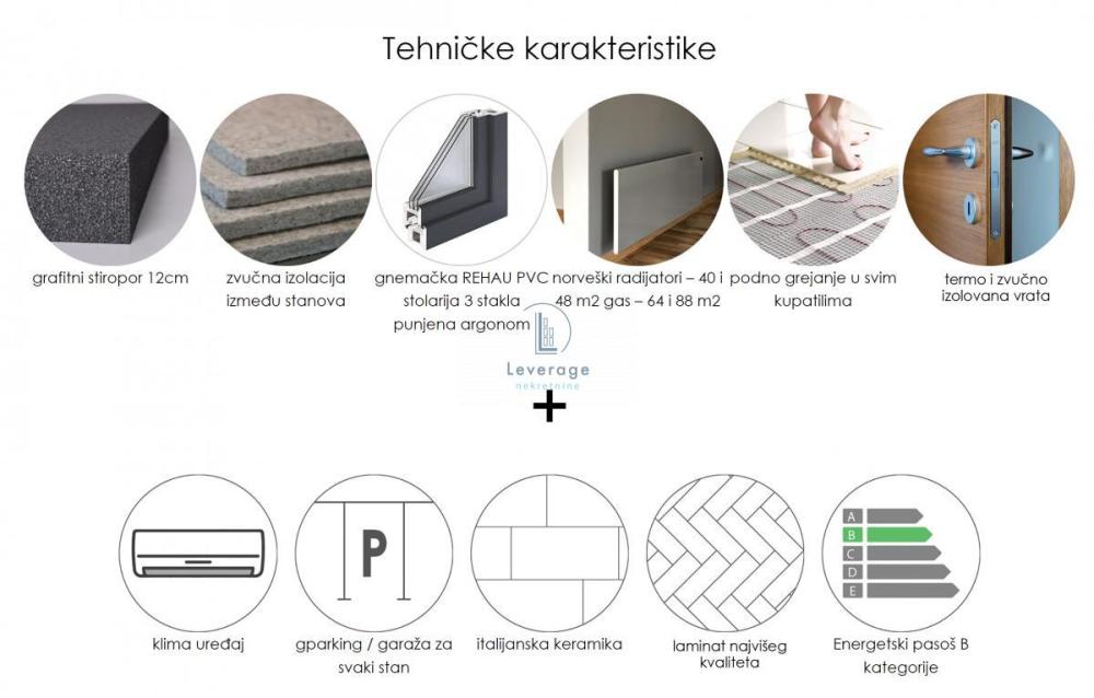 U gradnji su korišćeni najkvalitetniji materijali, uključujući grafitni stiropor za vrhunsku termoizolaciju, ALU stolariju, kao i kvalitetnu zvučnu izolaciju koja obezbeđuje mir i komfor u svakodnevnom životu.