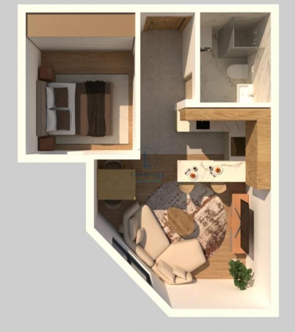 Stan se sastoji od dnevne sobe sa kuhinjom i trpezarijom, spavaće sobe, predsoblja, kupatila.