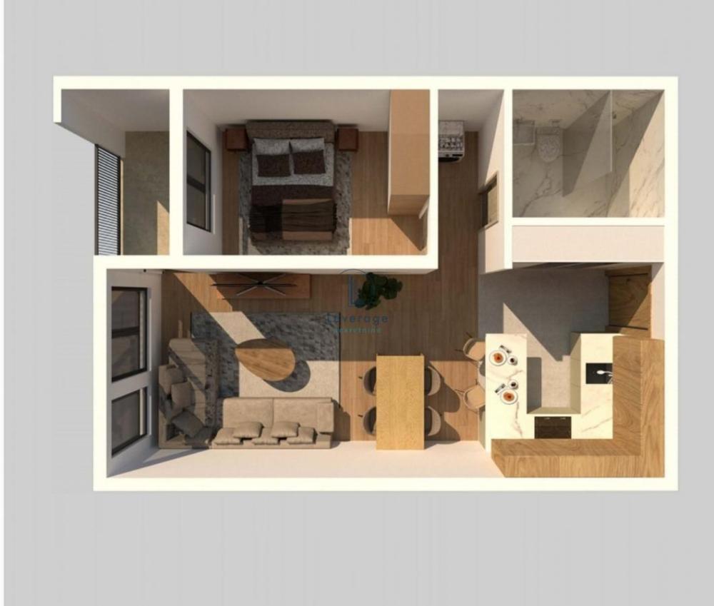 Stan se sastoji od dnevne sobe sa kuhinjom i trpezarijom, spavaće sobe, terase, predsoblja, kupatila i pretprostora.